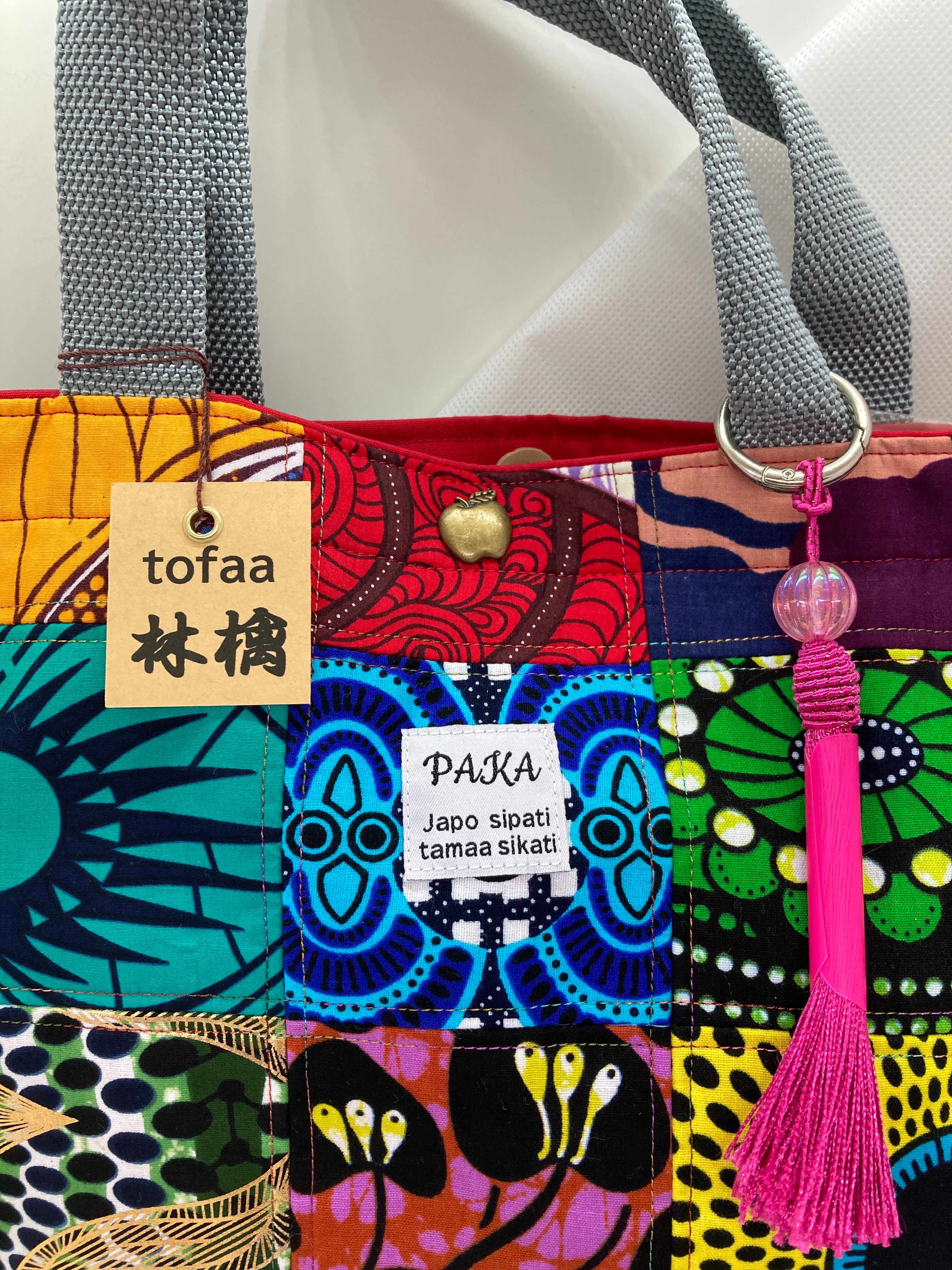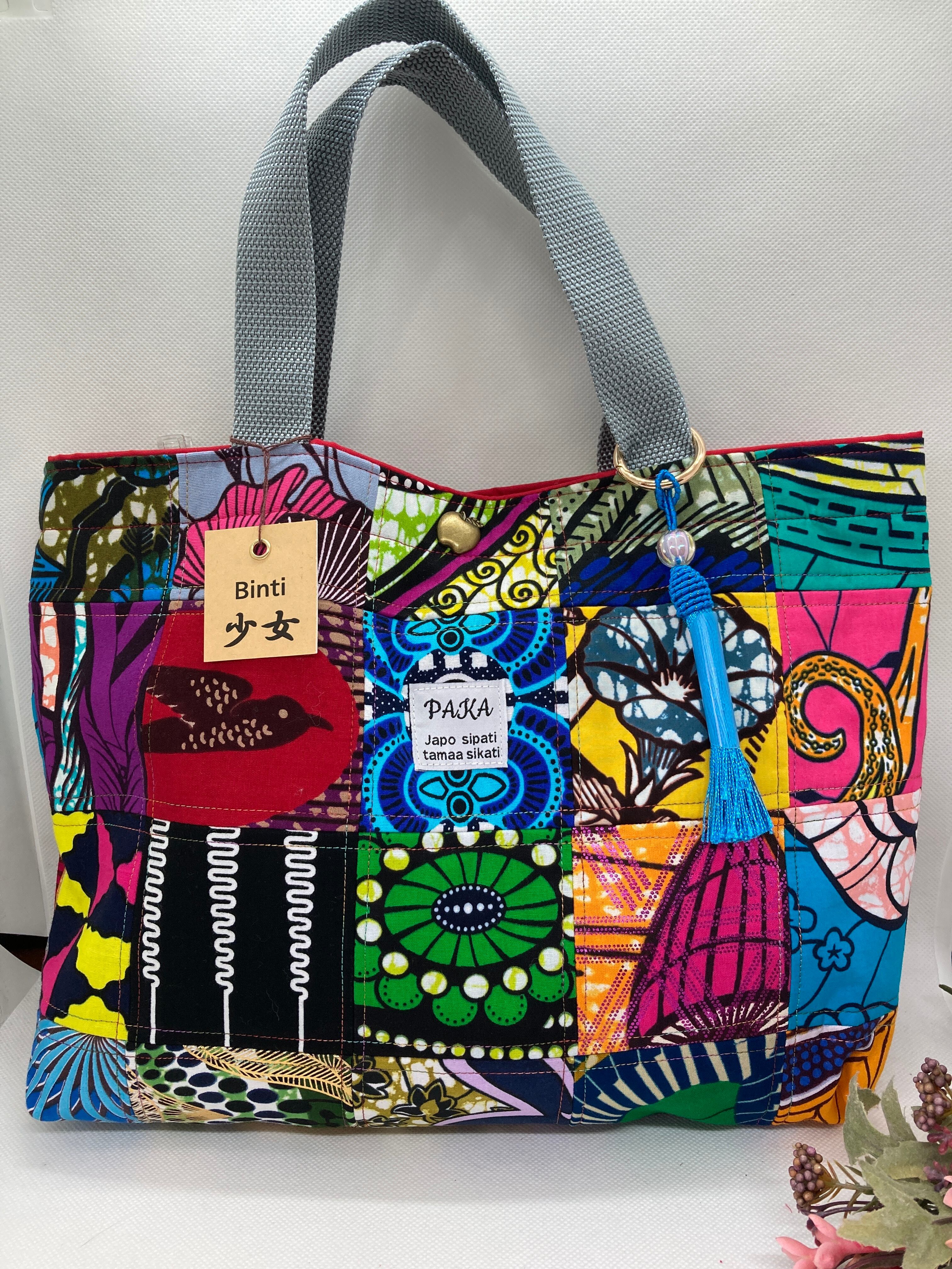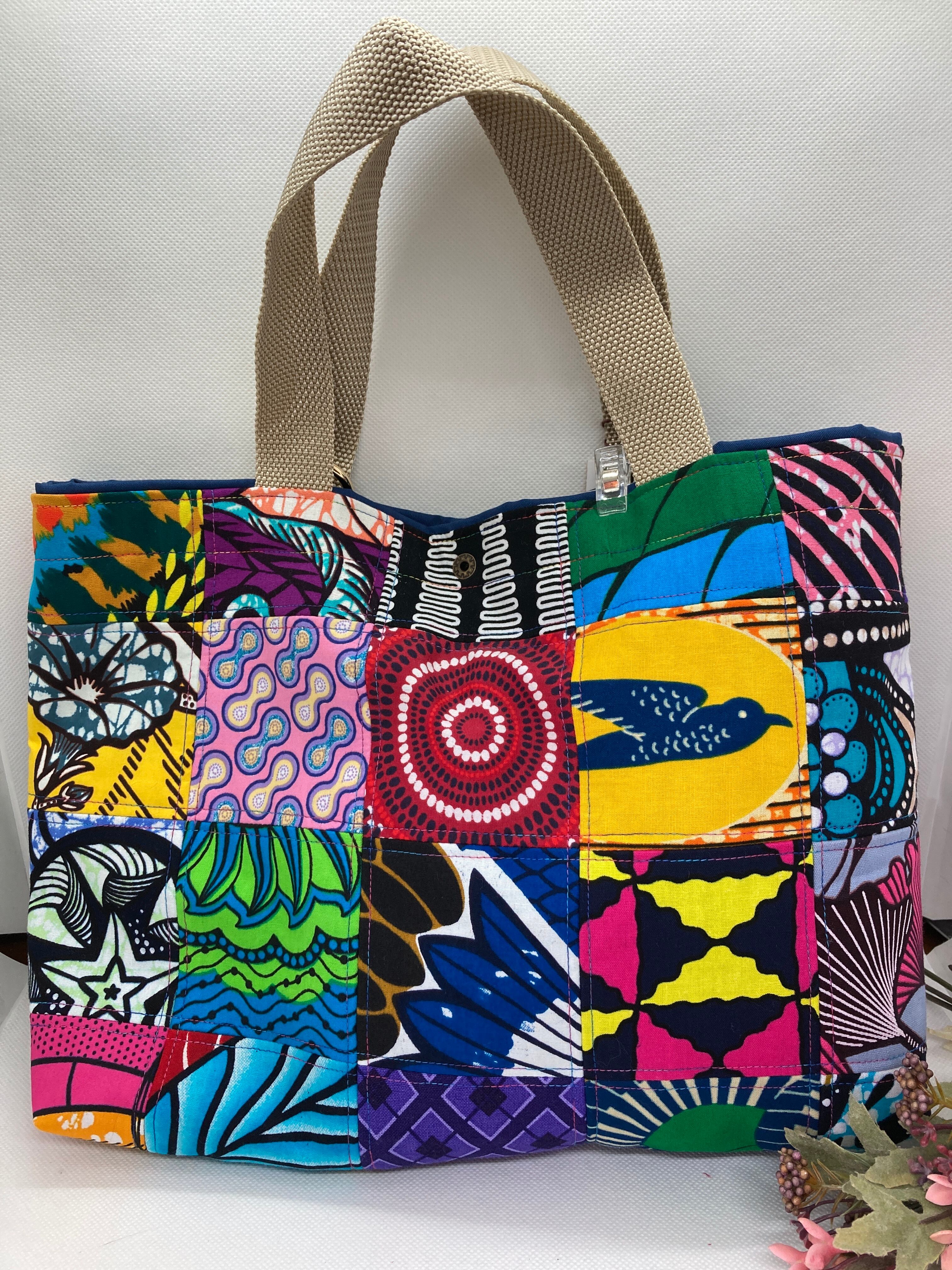 アフリカンバティック生地を贅沢に使用した、個性的なパッチワークトートです。