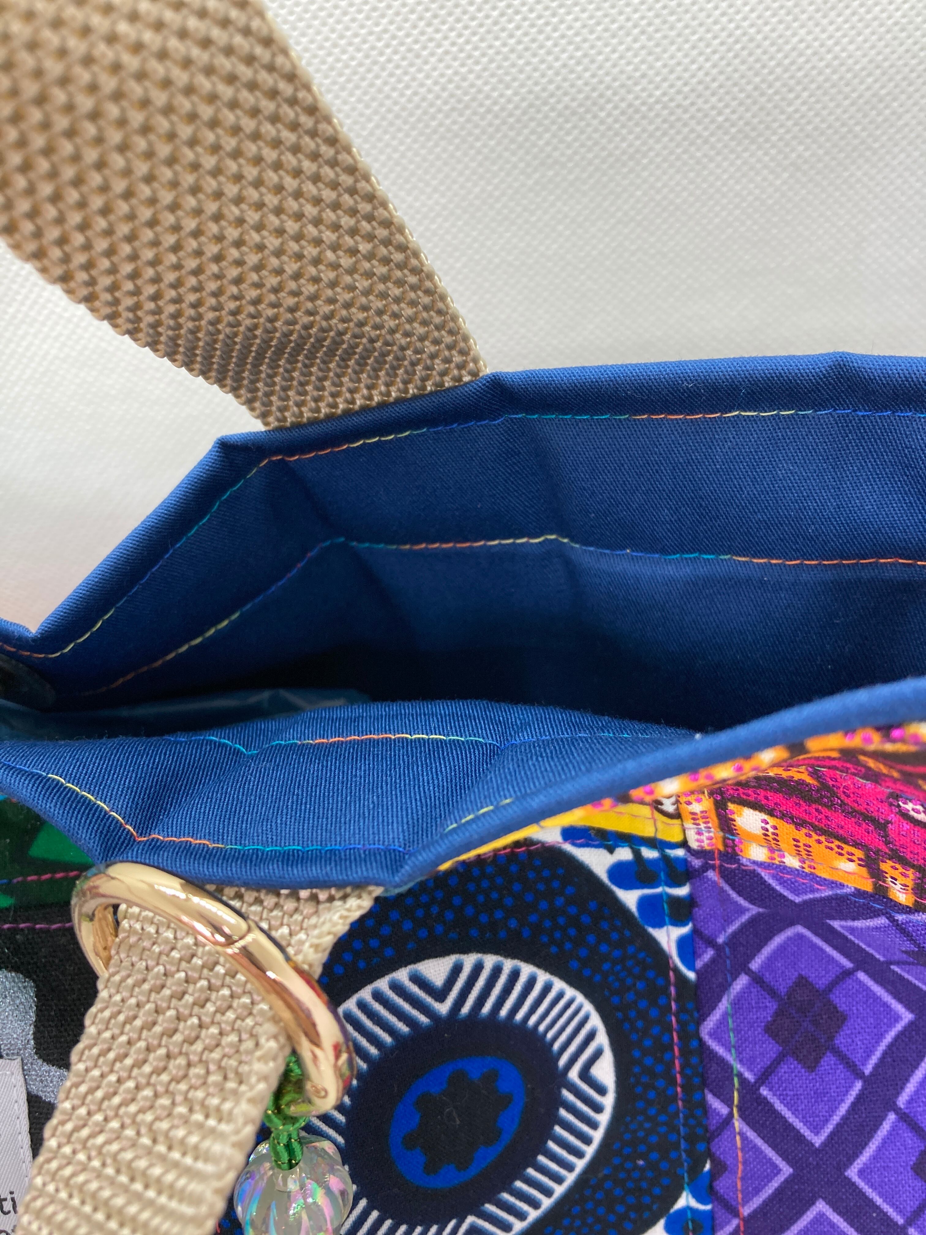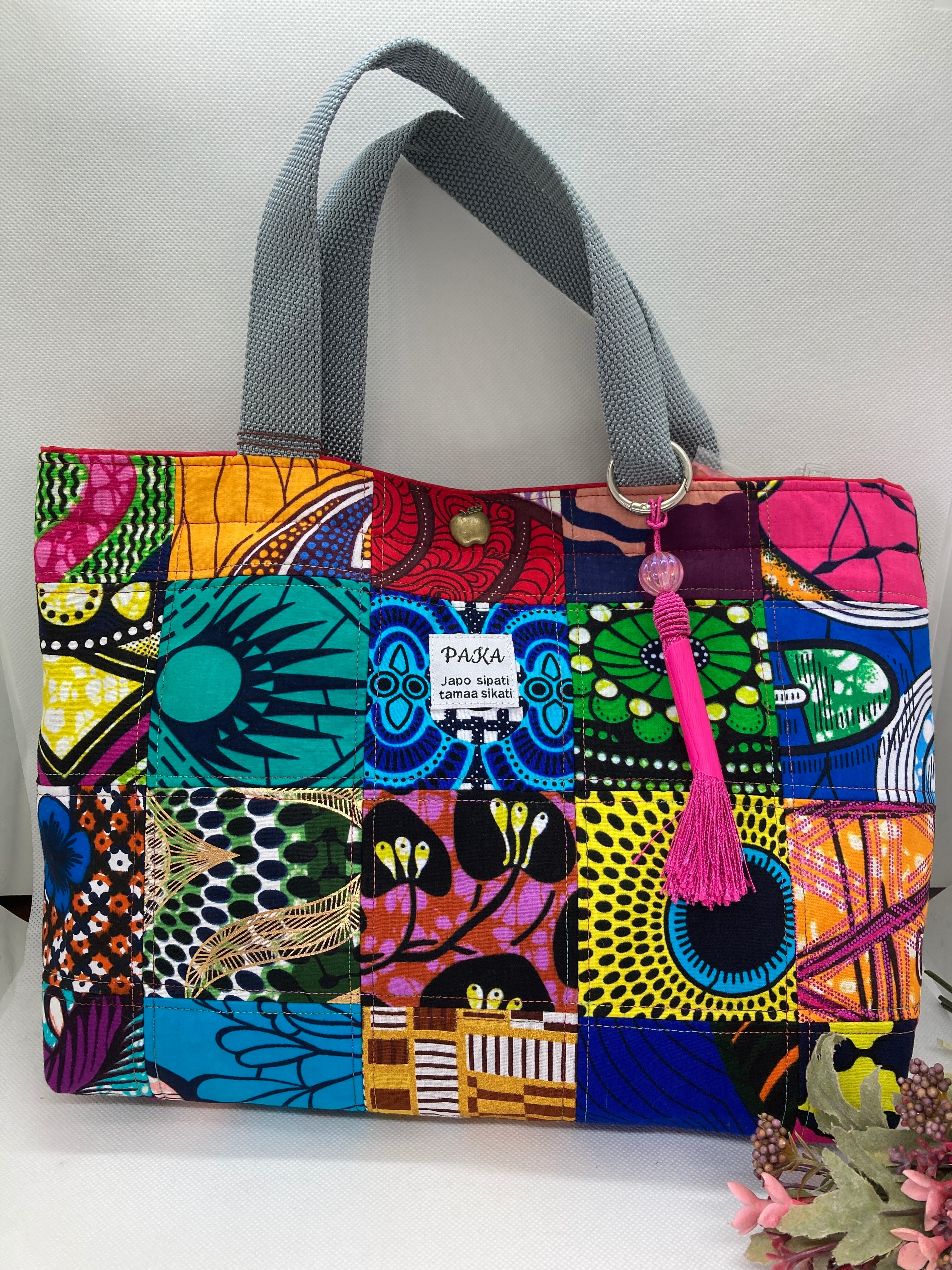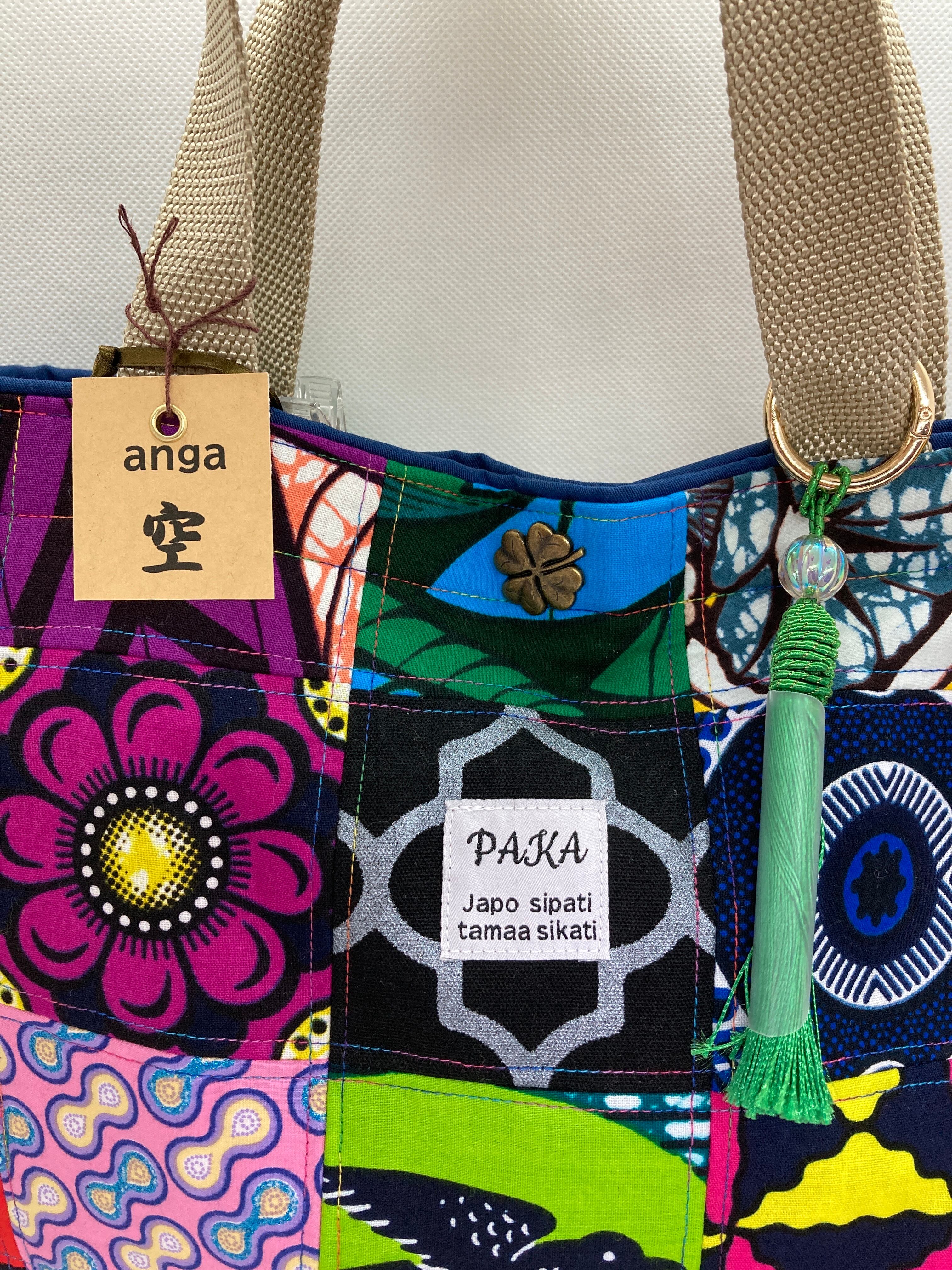 アフリカンバティック生地を贅沢に使用した、個性的なパッチワークトートです。